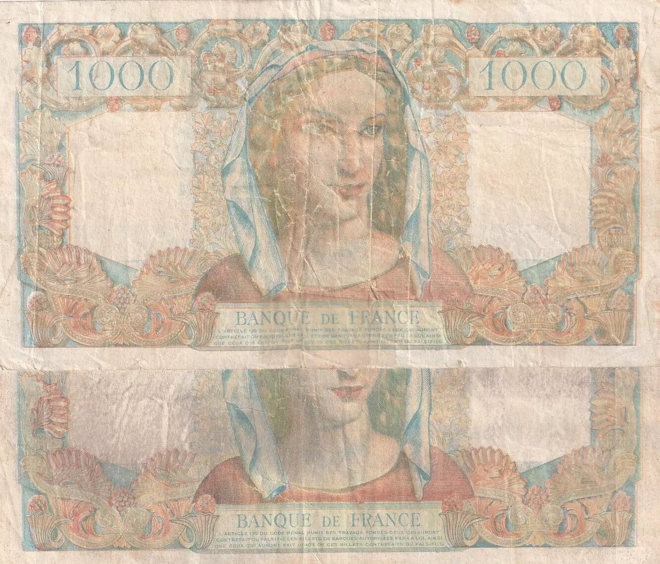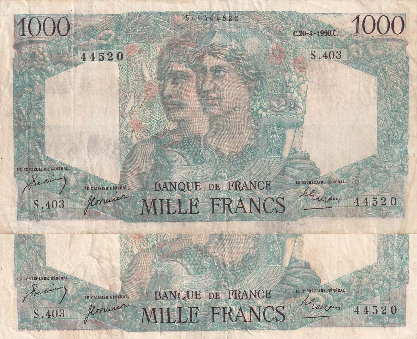 Vous retrouverez ici une paire de faux billets de 1000 Francs Minerve et Hercule (Numéros identiques). Réalisé par les fameux faussaires Rocher et Versini, ces derniers ont écoulés 40 millions d'exemplaires de faux billets au cours du 20ème siècle.