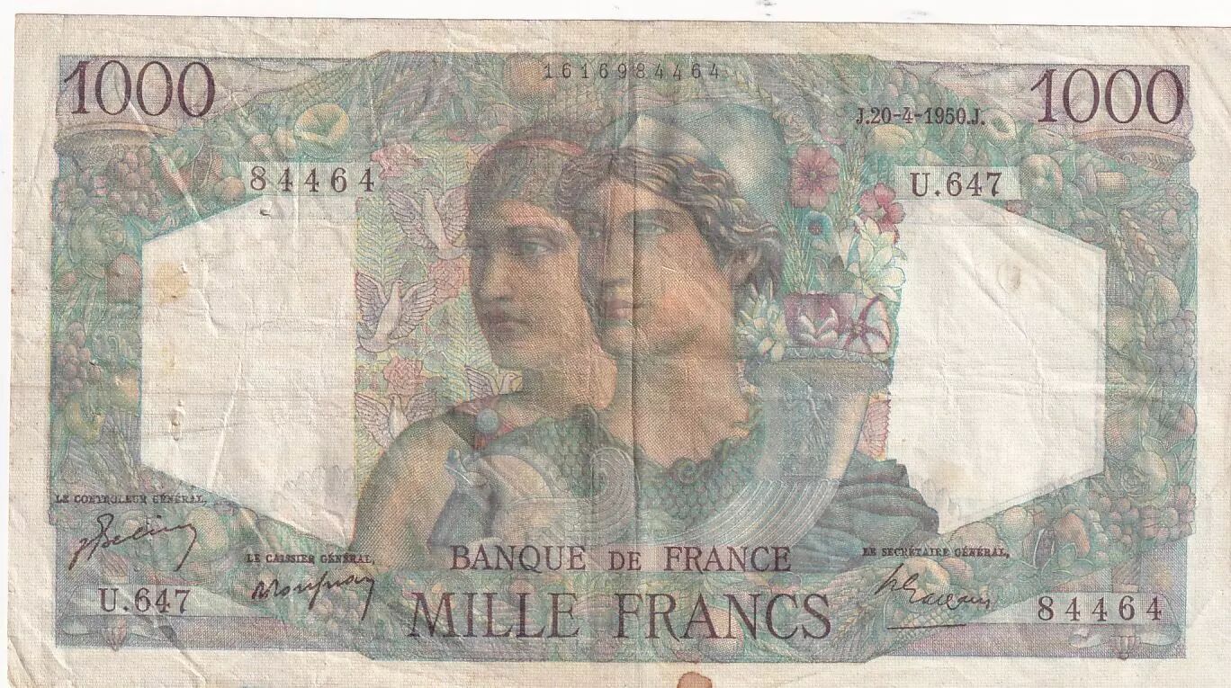 Accueil > Billets Français > Billets Banque de France > Billets 1000 francs > Minerve et Hercule type 1945 (1945-1950) > France 1000 Francs Minerve et Hercule - 20-04-1950 - Série U.647 - F.41.32