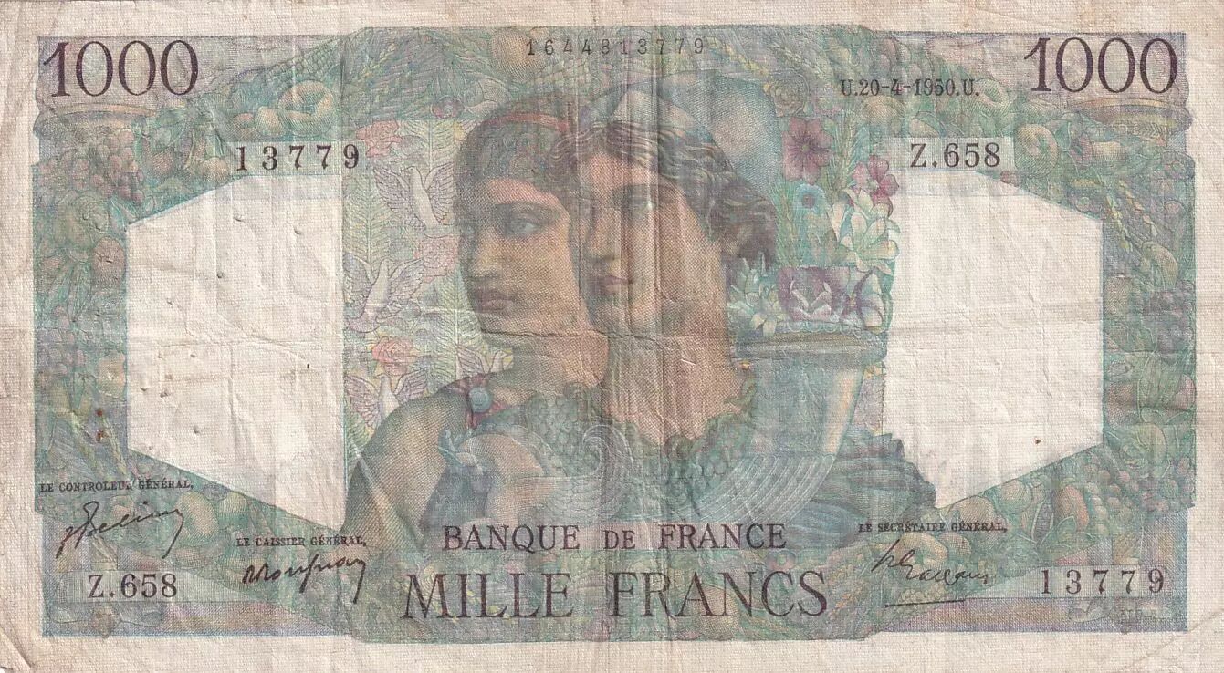 Accueil > Archivage > France 1000 Francs Minerve et Hercule - 20-04-1950 - Série Z.658 - F.41.32