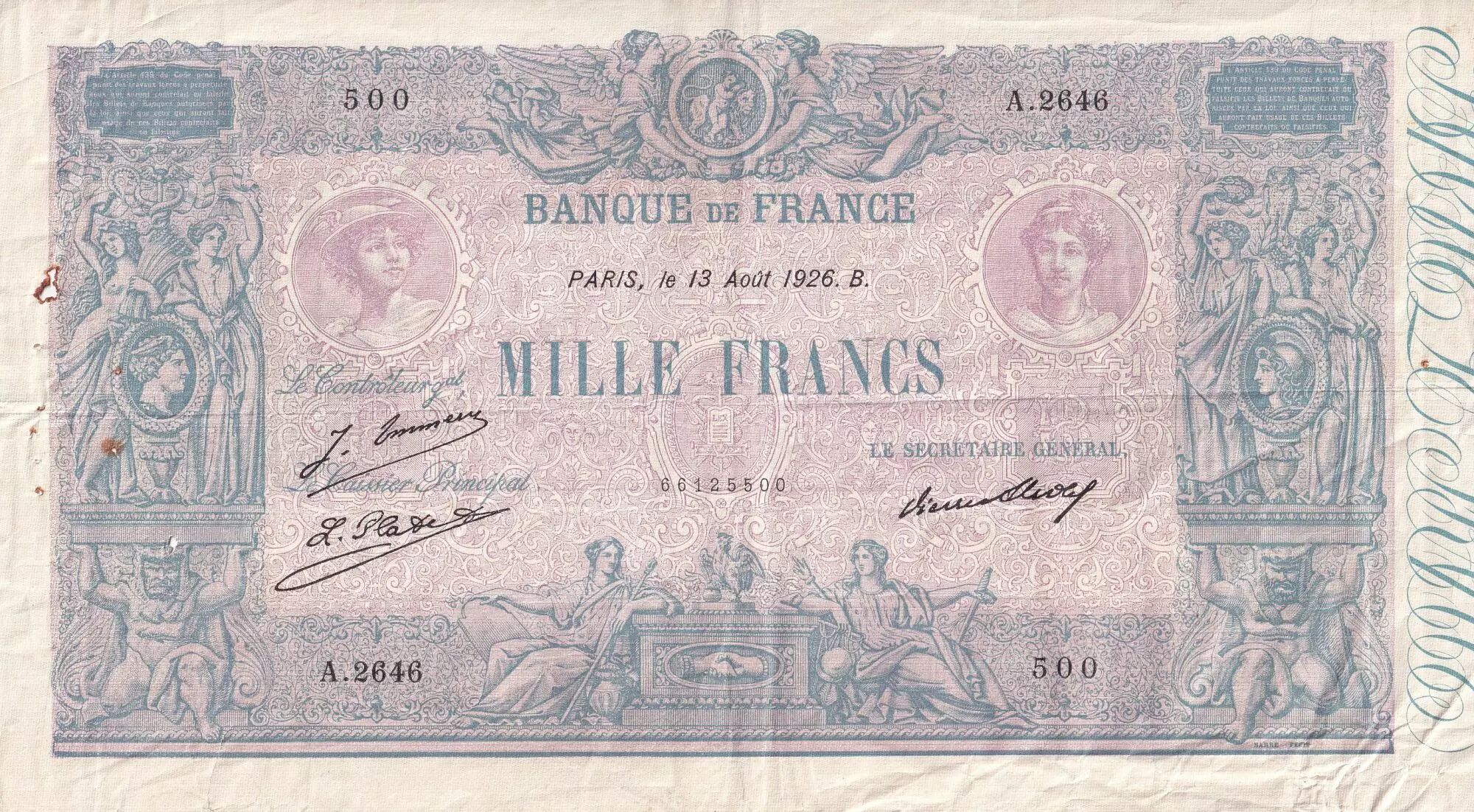 Banknote France 1000 Francs - Pink and blue - 13-08-1926 - Serial A.2646 - VF - P.67