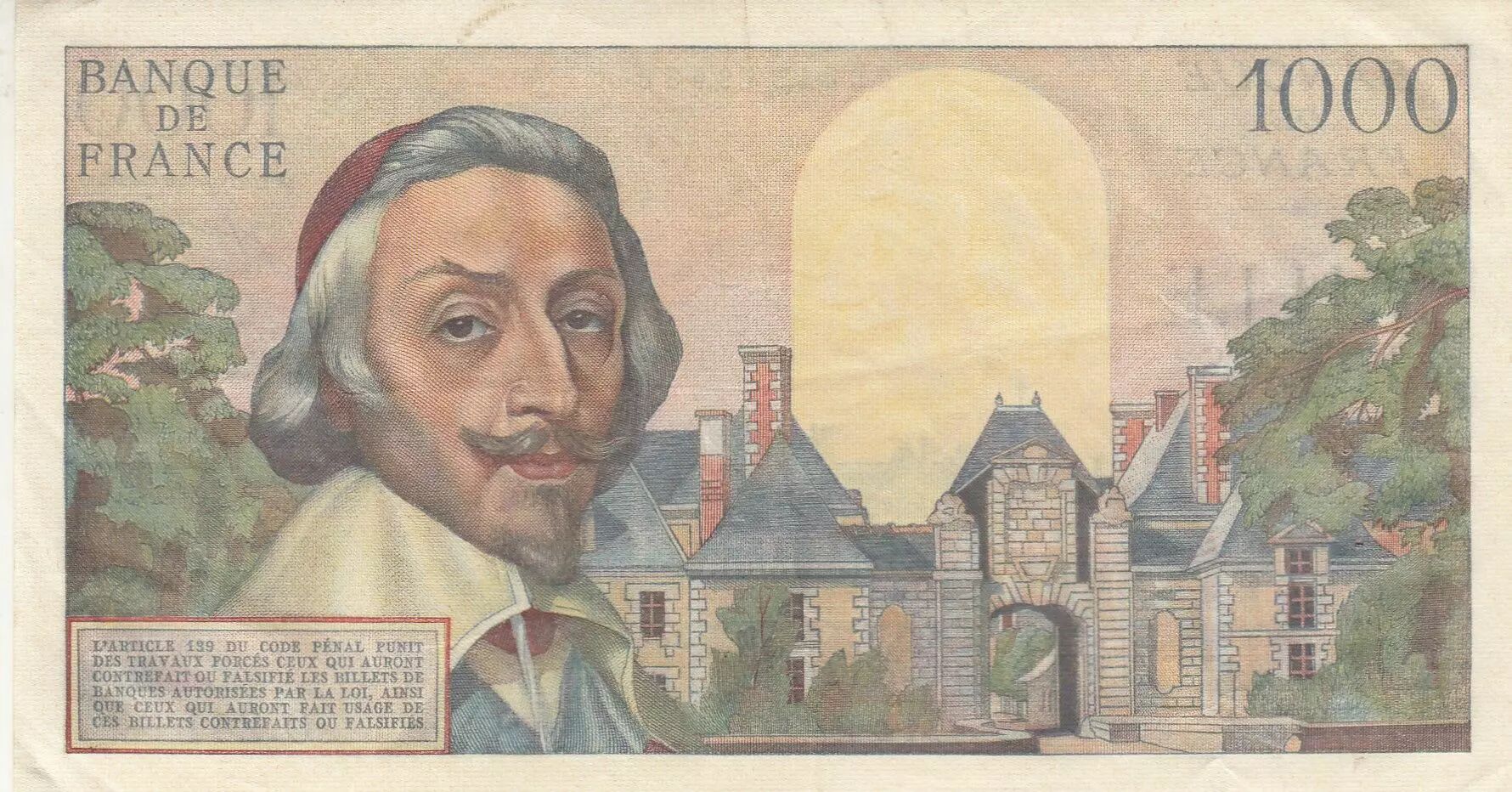 The back features another bust of Cardinal Richelieu, this time placed on the left. On the right, a monumental gate of the city of Richelieu can be seen. An inscription recalls Article 139 of the Penal Code, stipulating the penalties for counterfeiting or falsifying banknotes, as well as for using such counterfeit or falsified banknotes. Robert Armanelli engraved this side based on a drawing by Clément Serveau.