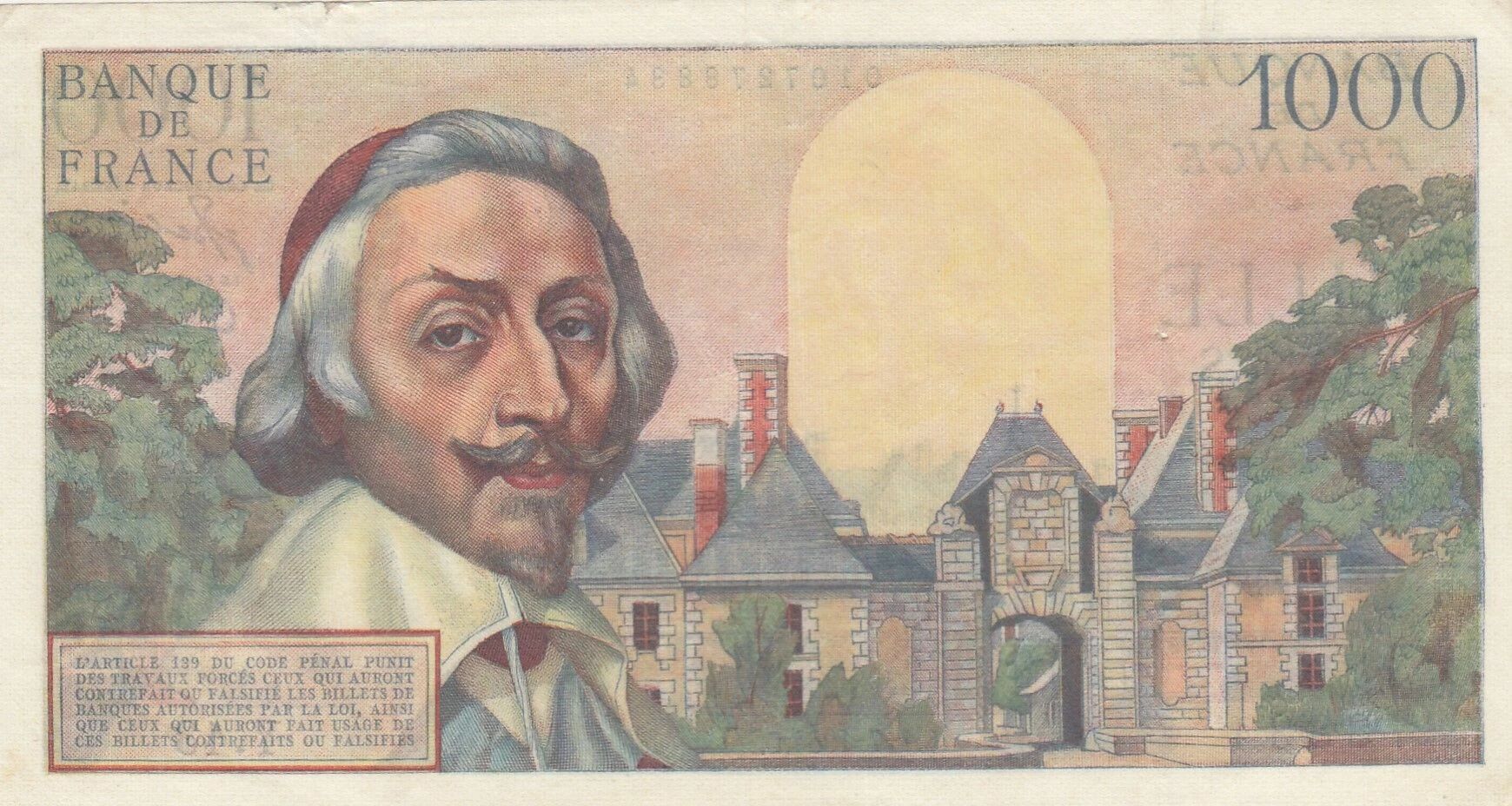This French banknote has a face value of 1000 francs. It was issued in 1954.