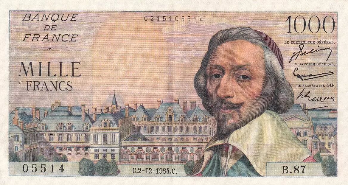 Le billet de 1000 Francs, type Richelieu, émis le 2 décembre 1954, fait partie d'une série identifiée par le code B.87. Ce billet est un témoignage de l'histoire monétaire française du milieu du 20ème siècle.