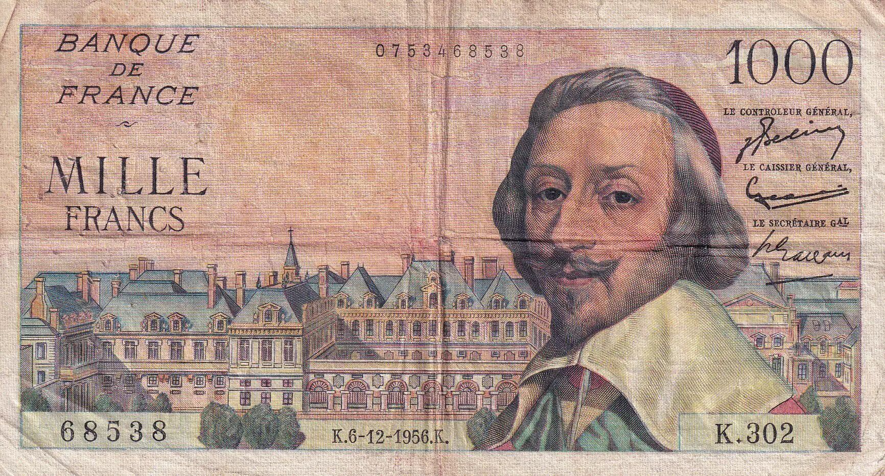 Home > > France 1000 Francs - Richelieu - 06-12-1956 - Serial K.302 - P.134