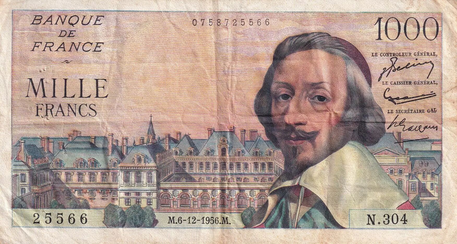 Banknote France 1000 Francs - Richelieu - 06-12-1956 - Serial N.304 - P.134