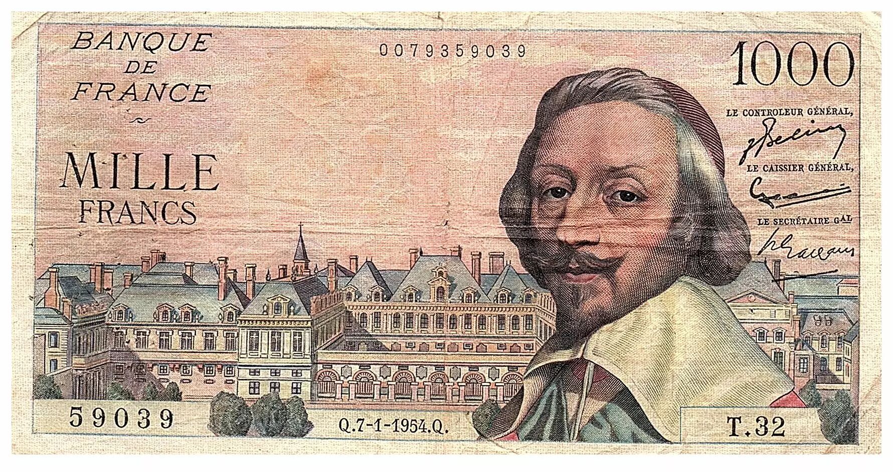 Accueil > Archivage > France 1000 Francs Richelieu - 07-01-1954 - Série T.32 - Fay.42.04