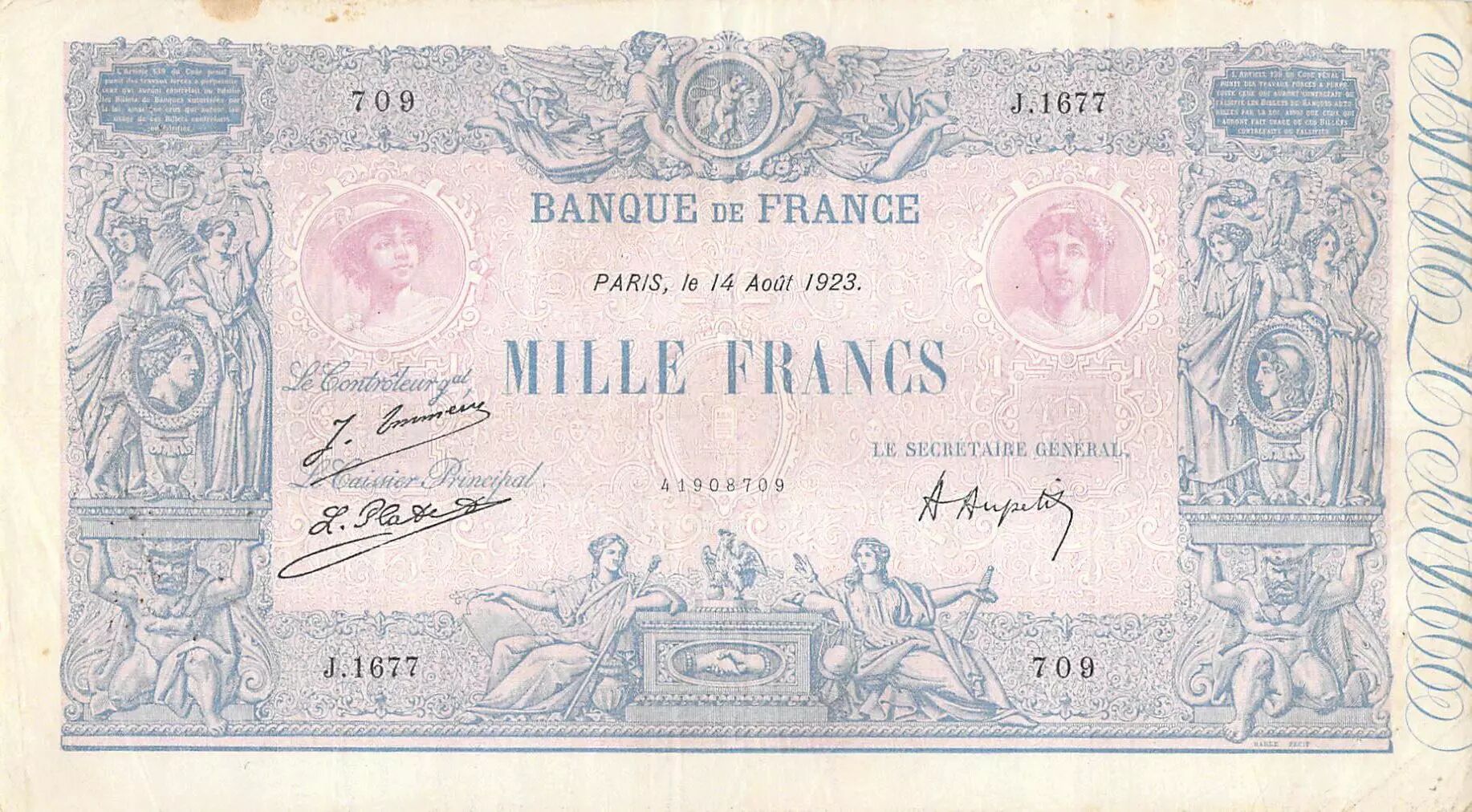 Accueil > Archivage > France 1000 Francs Rose et Bleu - 14-08-1923 - Série J.1677 - TTB