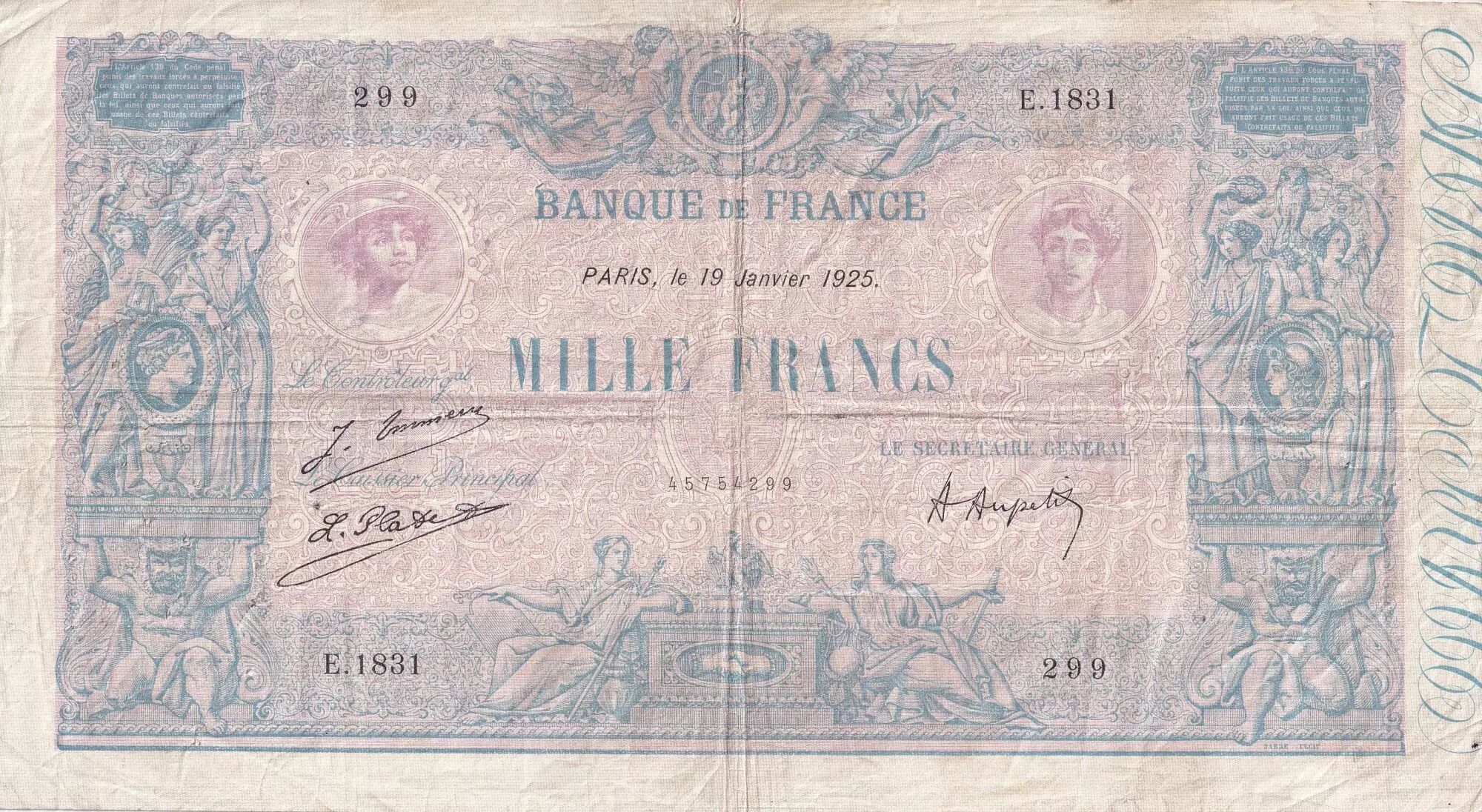Accueil > Billets Français > Billets Banque de France > Billets 1000 francs > Bleu et Rose type 1889 (1889-1926) > France 1000 Francs - Rose et Bleu - 19-01-1925 - Série E.1831 - F.36.41