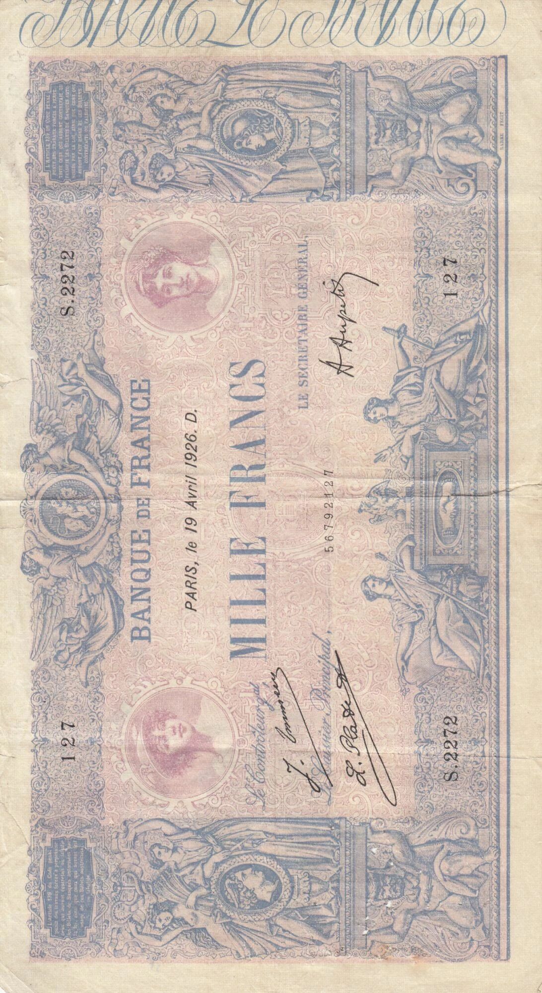 Ce billet de banque français a une valeur nominale de 1000 francs. Il a été émis en France, avec une date d'émission du 19 avril 1926. Le billet appartient à la série S.2272.