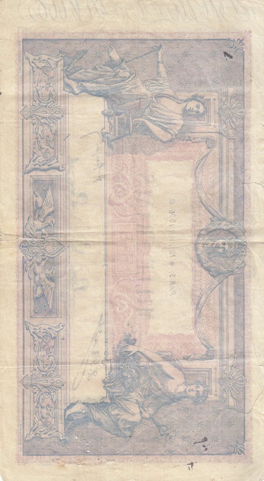 Le recto du billet présente un fond de couleur dominante rose et bleu. Les motifs incluent des représentations allégoriques et des ornements complexes typiques des billets de banque de cette époque. La valeur faciale, « 1000 Francs », est clairement indiquée, ainsi que les mentions légales et les signatures des responsables de l'émission.