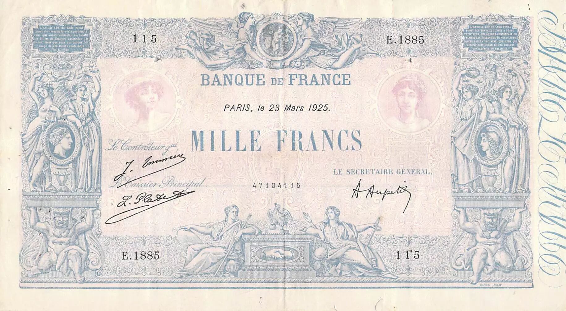 Accueil > Archivage > France 1000 Francs Rose et Bleu - 23-03-1925 - Série E.1885 - PTTB