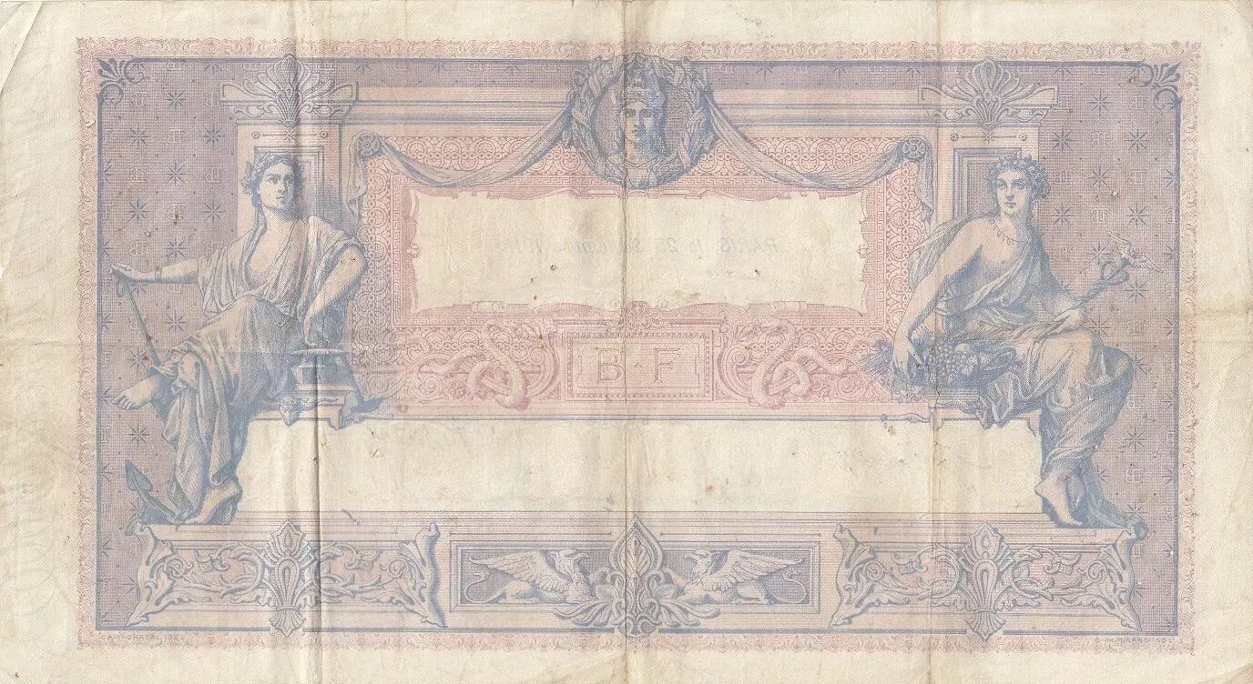 Le verso du billet reprend les mêmes couleurs dominantes, rose et bleu, avec une continuité dans le style artistique et les motifs décoratifs. On y retrouve également des représentations allégoriques et des ornements complexes qui encadrent les informations essentielles. La valeur nominale est une fois de plus mise en évidence, assurant une identification facile. Les mentions légales et les signatures des responsables de l'émission sont également présentes, garantissant la validité du billet. La conception du verso est pensée pour compléter le recto, créant ainsi un ensemble harmonieux et esthétiquement plaisant.