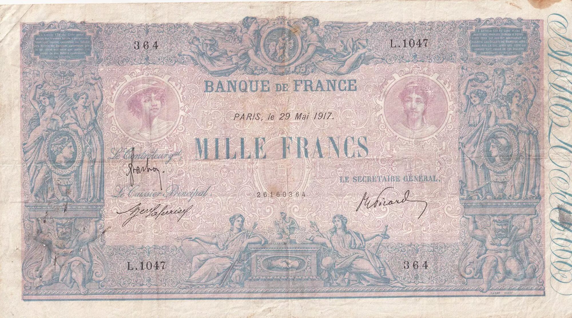 Accueil > Archivage > archivage-Billets Français > France 1000 Francs - Rose et Bleu - 29-05-1917 - Série L.1047 - F.36.31