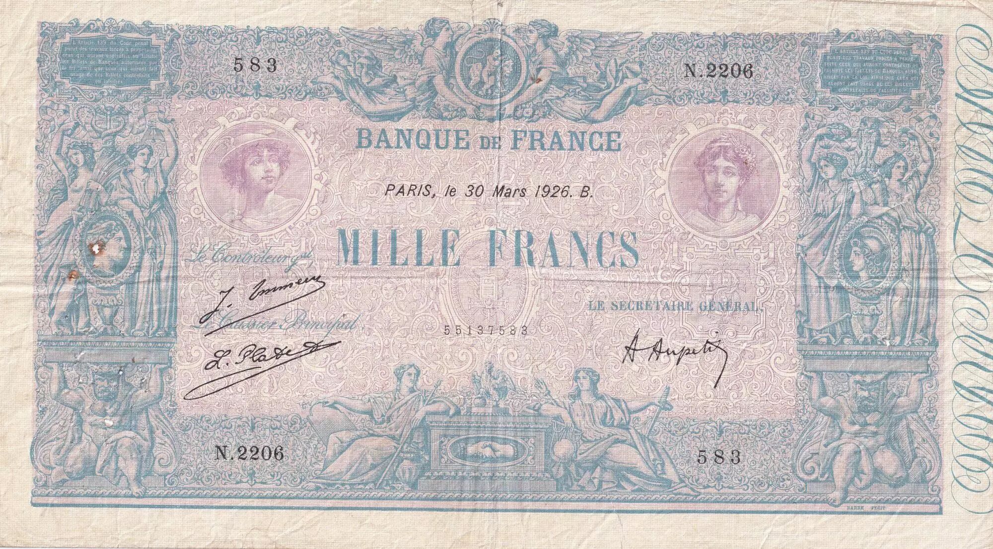 Accueil > Archivage > France 1000 Francs - Rose et Bleu - 30-03-1926 - Série N.2206 - F.36.42
