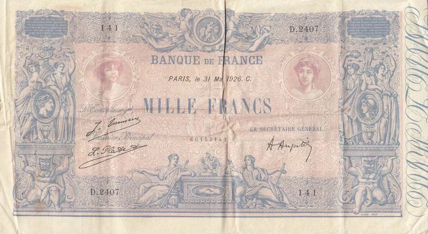 Le billet de 1000 Francs, émis le 31 mai 1926, est un exemple de la production fiduciaire française de l'entre-deux-guerres. Ce billet appartient à une série identifiée par le code "D.2407".