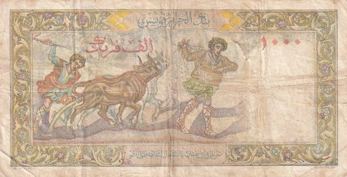 On the front of the banknote, one can read the inscription "Banque de l'Algérie et de la Tunisie Mille Francs W. FEL FEC. A. MARLIAT SC.". André Marliat is credited as the engraver and William Fel as the designer of this part of the banknote. The back of the banknote depicts a scene of plowing fields, with an inscription in Arabic. Joseph Broutin is identified as the engraver of the back, while William Fel is the designer, with the inscription "W. FEL FEC. BROUTIN SC".