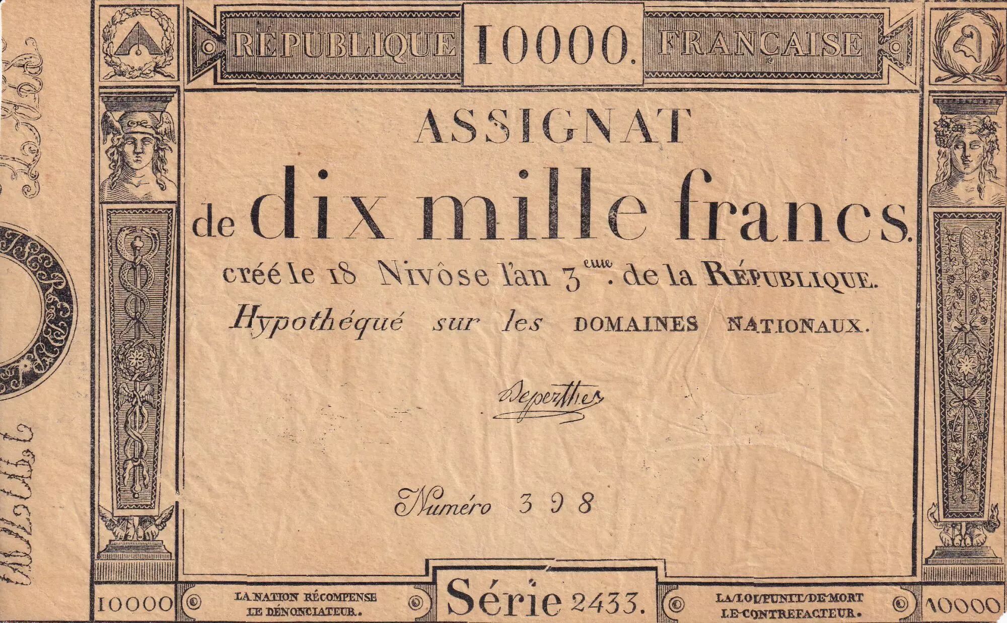 Banknote France 10000 Francs - 18 Nivose An III - 7.1.1795 - Sign. Deperthe - VF