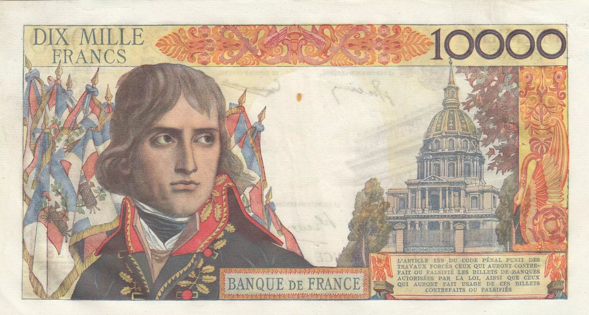 Le billet de 10000 Francs, émis par la Banque de France en 1956, est un spécimen de la série K.28. Il rend hommage à Napoléon Bonaparte, figure emblématique de l'histoire de France, à travers des représentations de sa personne et de symboles associés à son règne.