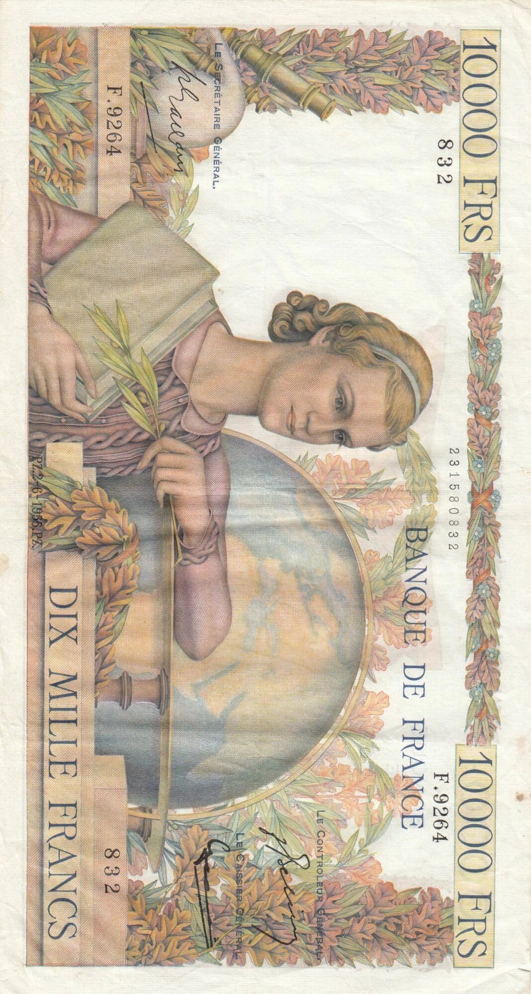 The face value of this banknote is 10,000 francs. The monetary unit is therefore the French franc, which was in circulation at that time. The year of issue, 1955, is an important indication for collectors and historians, allowing them to place the banknote in its economic and social context.