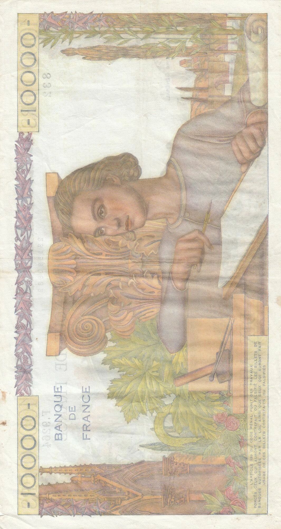 On the main face of the banknote, there is an allegorical representation of the French Genius. This figure symbolizes the creative and innovative spirit of the nation. The design highlights visual elements that evoke the grandeur and cultural heritage of France.