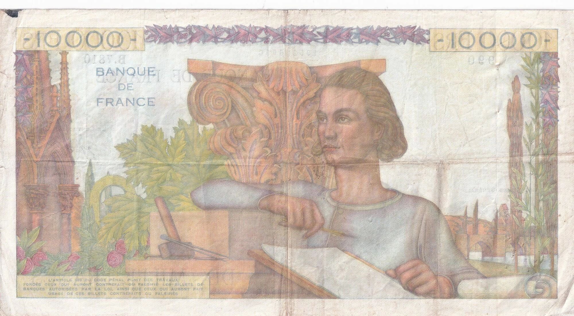 Les inscriptions "10 000 FRS" apparaissent à deux reprises, encadrant la mention "BANQUE DE FRANCE". La valeur nominale, "DIX MILLE FRANCS", est également inscrite en toutes lettres. Le recto est le fruit du travail de plusieurs artistes : Sébastien Laurent en tant que dessinateur, et Jules Piel et Georges Léon Égalité Beltrand en tant que graveurs.