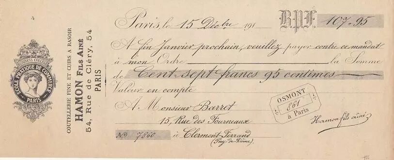 Accueil > Billets Français > Billets de Nécessités (1789-1945) > Bons de villes et de communes 1914-1925 > France 107.95 francs - Reçu de chèque de banque - Clermont-Ferrand - 27-01-1912