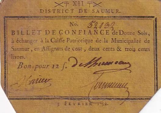 Banknote France 12 Sols - Maine et loire - District de Saumur - 03-02-1792