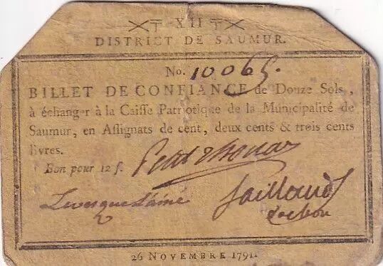 Banknote France 12 Sols - Maine et loire - District de Saumur - 26-11-1791