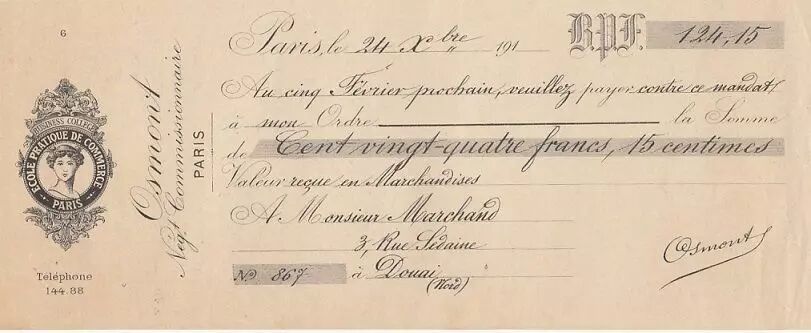 Billet France 124,15 francs - Reçu de chèque de banque - Ecole pratique de commerce Paris - 27-01-1910