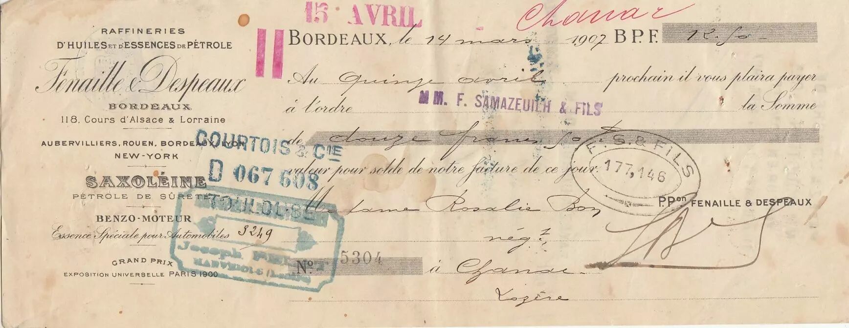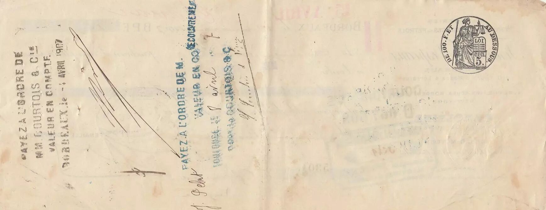 Billet France 12.5 francs - Reçu de chèque de banque - Fenaille et Despeaux - 1907