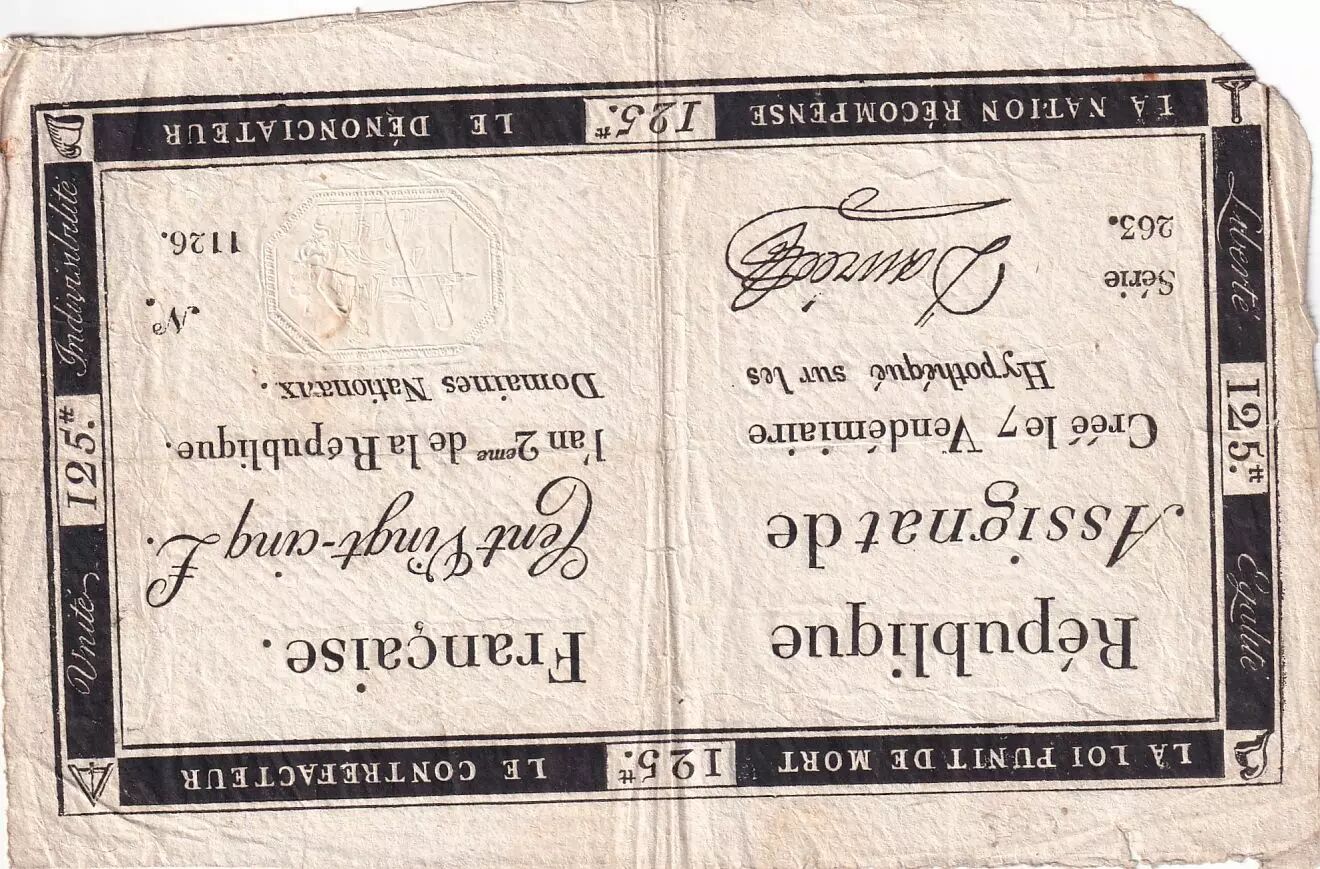 Billet France 125 Livres - 7 Vendémiaire An II - 1793 - PTB - Sign. Du Laurent