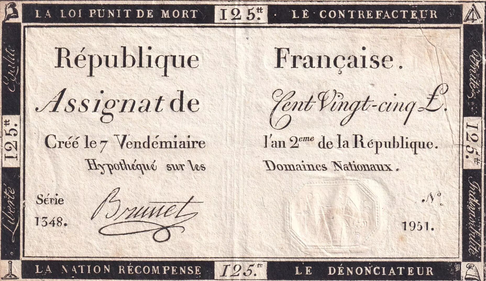 Billet France 125 Livres - 7 Vendémiaire An II - 1793 - Sign. Brunet - Série 1348