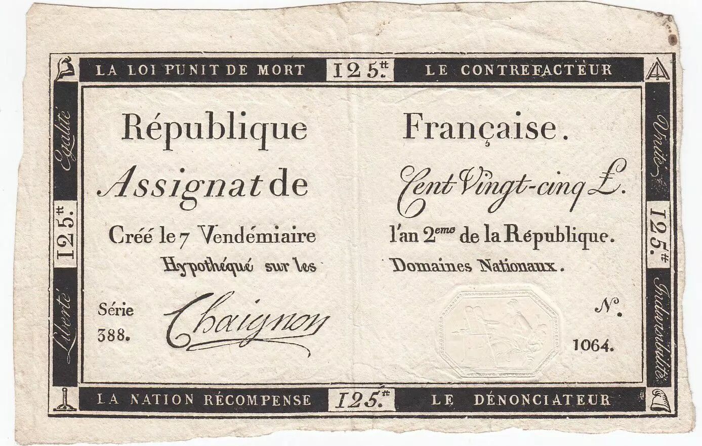 Billet France 125 Livres - 7 Vendémiaire An II - 1793 - Sign. Chaignon - TTB+