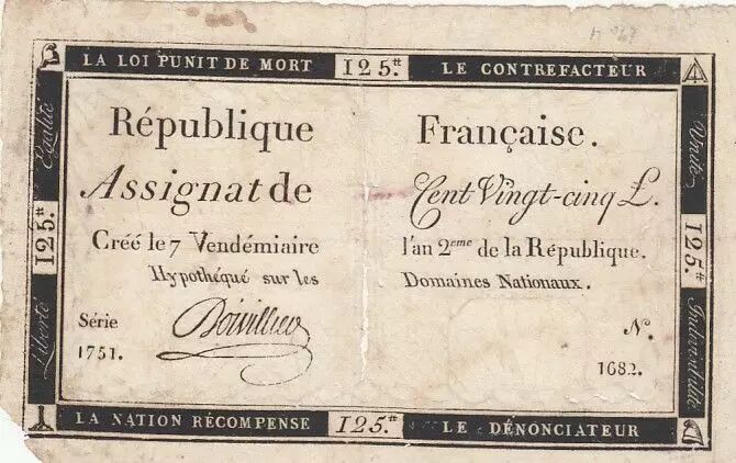 Accueil > Archivage > archivage-Archivage > France 125 Livres - 7 Vendémiaire An II - 1793 - Sign. Doivillier - Série 1751