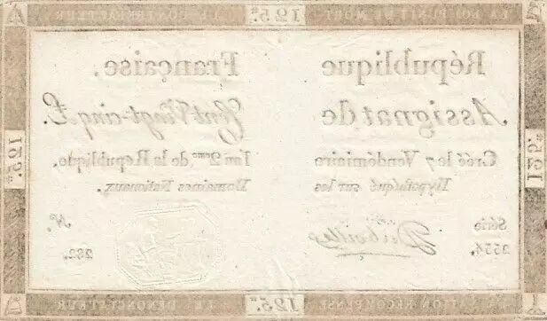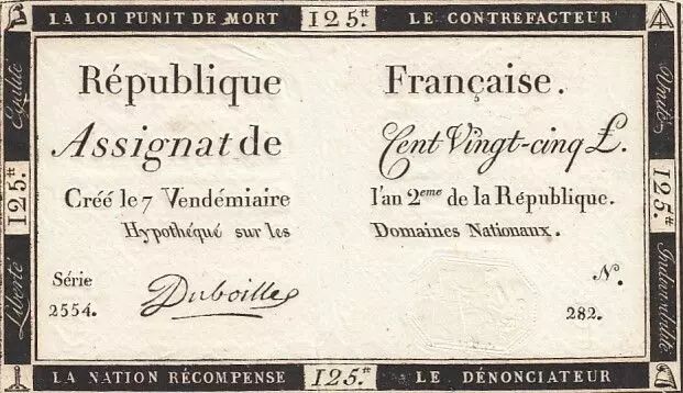 Banknote France 125 Livres - 7 Vendémiaire An II - 1793 - Sign. Duboille - Serial 2554