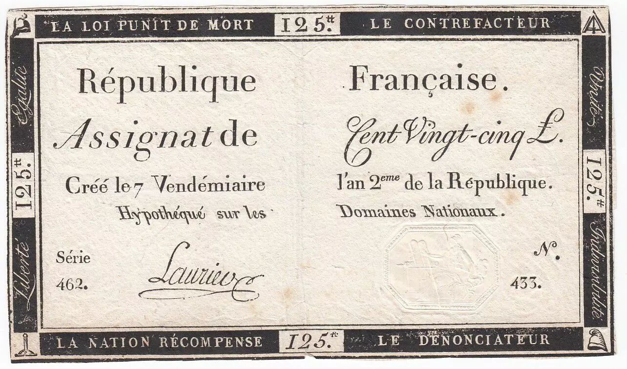 Banknote France 125 Livres - 7 Vendémiaire An II - 1793 - Sign. Laurier - VF+