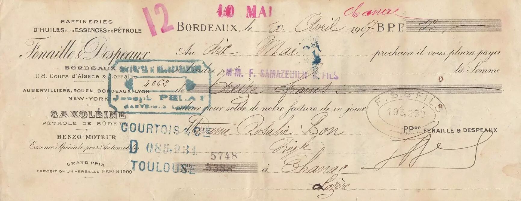 Banknote France 13 francs - Bank cheque receipt - Fenaille & Despeaux - 1907