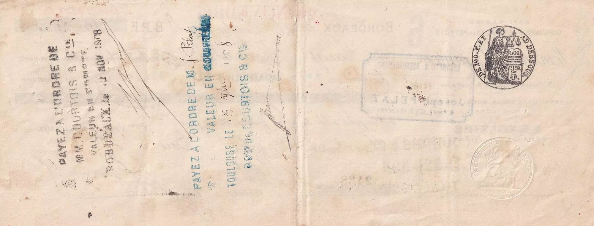 Accueil > Billets du Monde > Chèques et travellers Chèques > France 14 francs - Reçu de chèque de banque - Raffineries d'huiles et d'essences de pétrole - 1908