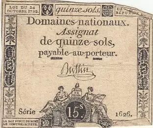 Billet France 15 sols - Femmes, bonnet phygien (24-10-1792) - Sign. Buttin - Série 1626