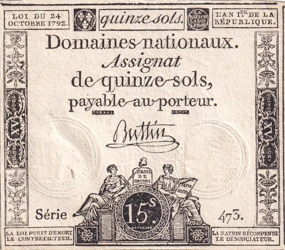 Banknote France 15 sols French Revolution - Sign. Buttin - Serial 473
