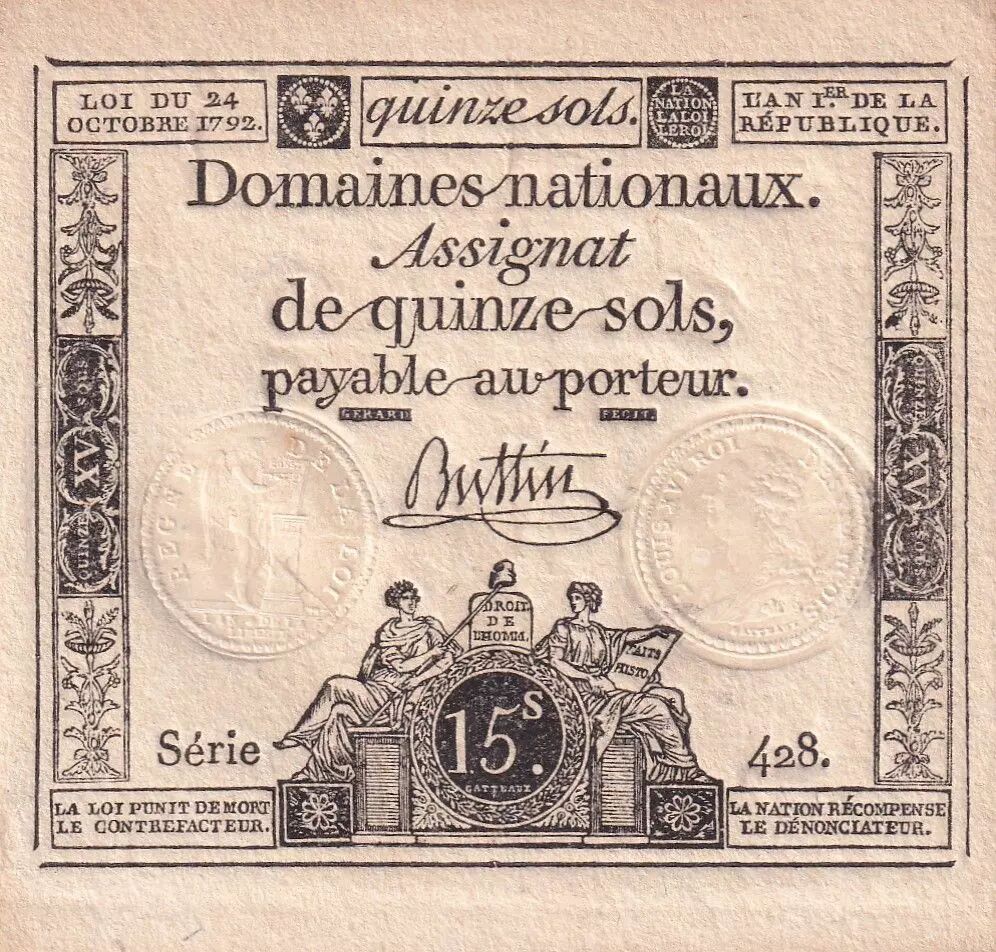 Billet France 15 sols Liberté et Droit (24-10-1792) - Sign. Buttin - Série 428