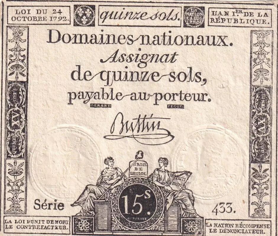 Billet France 15 sols Liberté et Droit (24-10-1792) - Sign. Buttin - Série 433