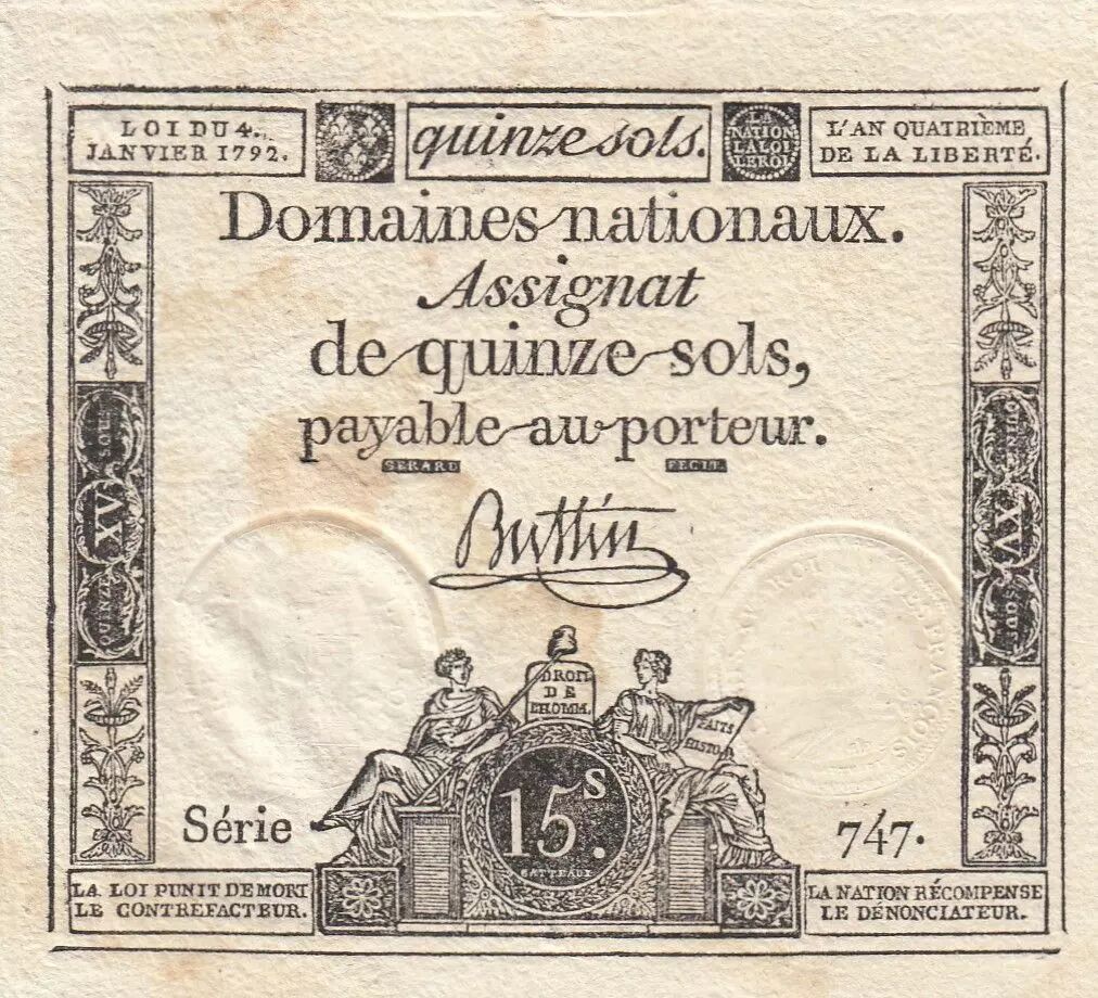 Banknote France 15 Sols - Liberty and Justice - 04-01-1792 - Sign. Buttin - Serial 747