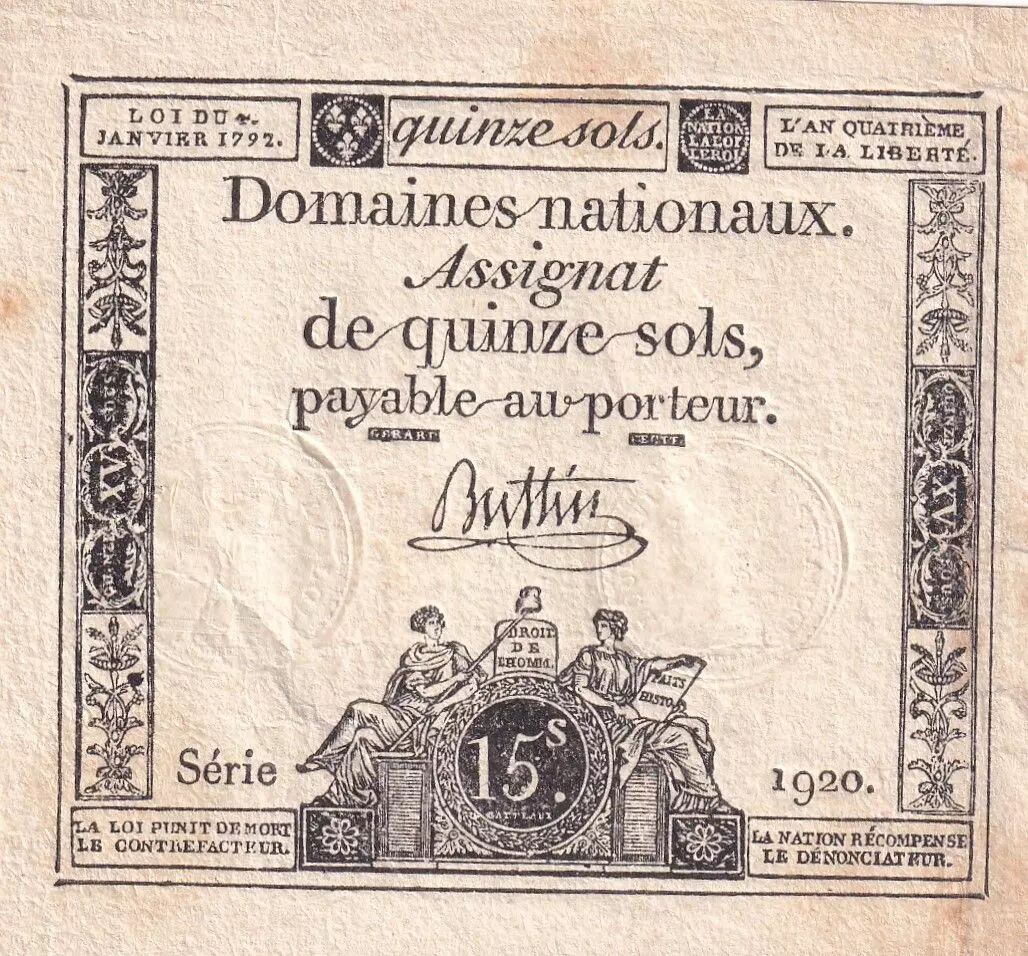 Banknote France 15 Sols - Liberty and Justice 1792 - Sign. Buttin - Serial 1920