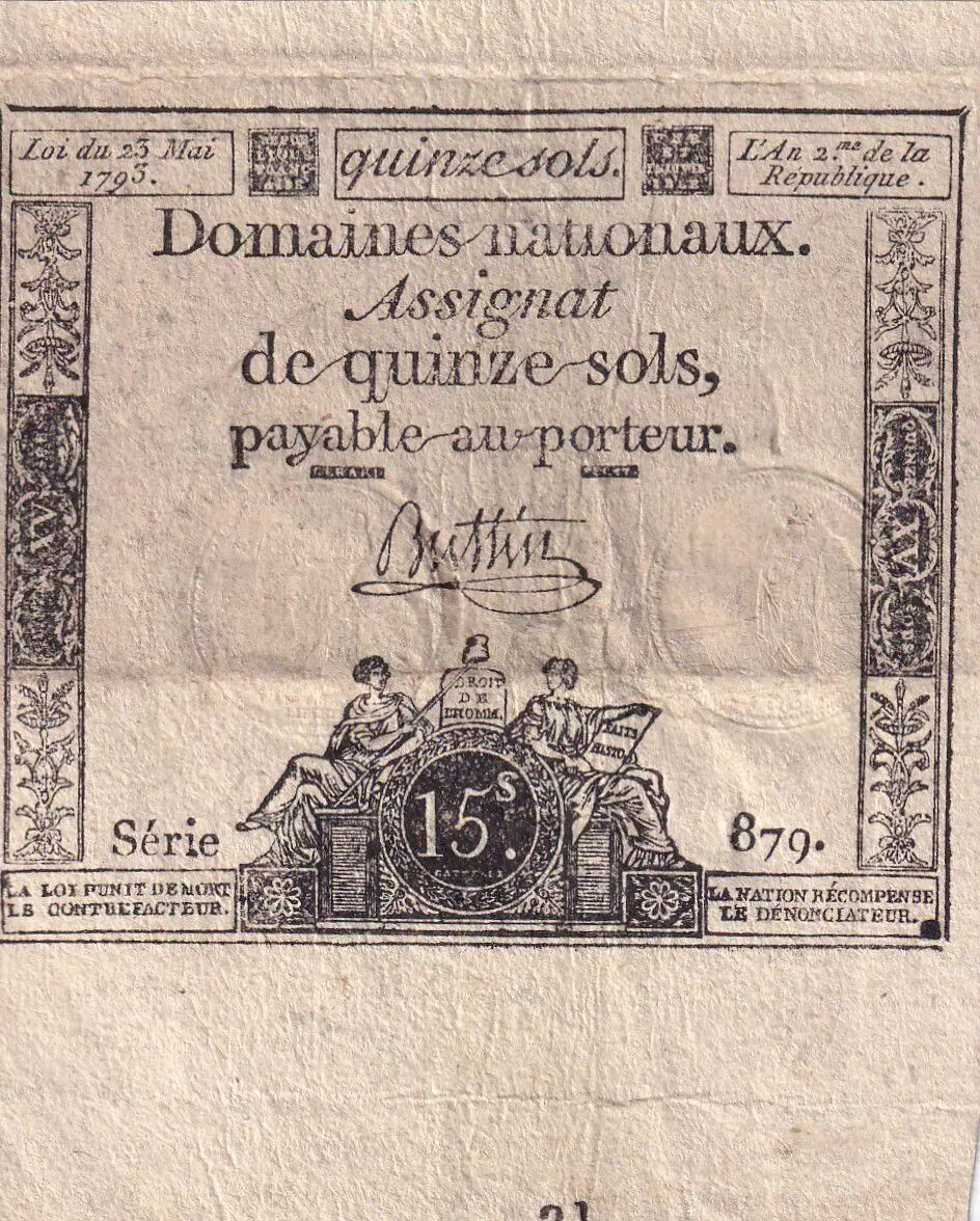 Banknote France 15 Sols - Liberty and Justice - 23-05-1793 - Sign. Buttin - Serial 879 - P. A.54