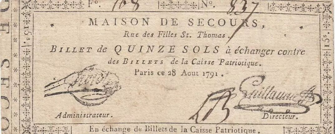 Billet France 15 sols - Maison de secours, rue des filles St. Thomas - 1791