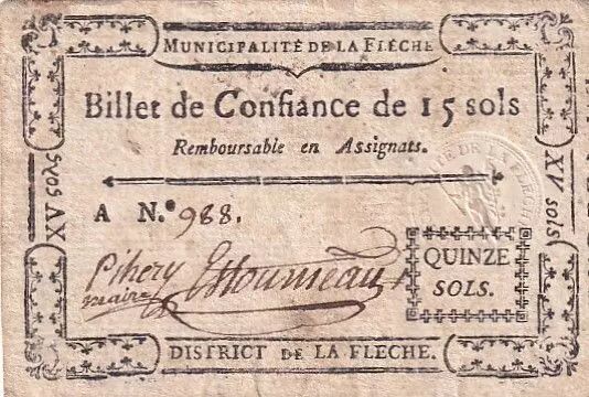 Banknote France 15 Sols - Sarthe - Municipalité de la Flèche - Serial A - 1791
