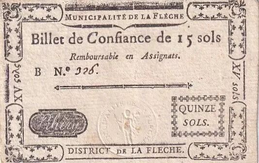 Billet France 15 Sols - Sarthe - Municipalité de la Flèche - Série B - 1791