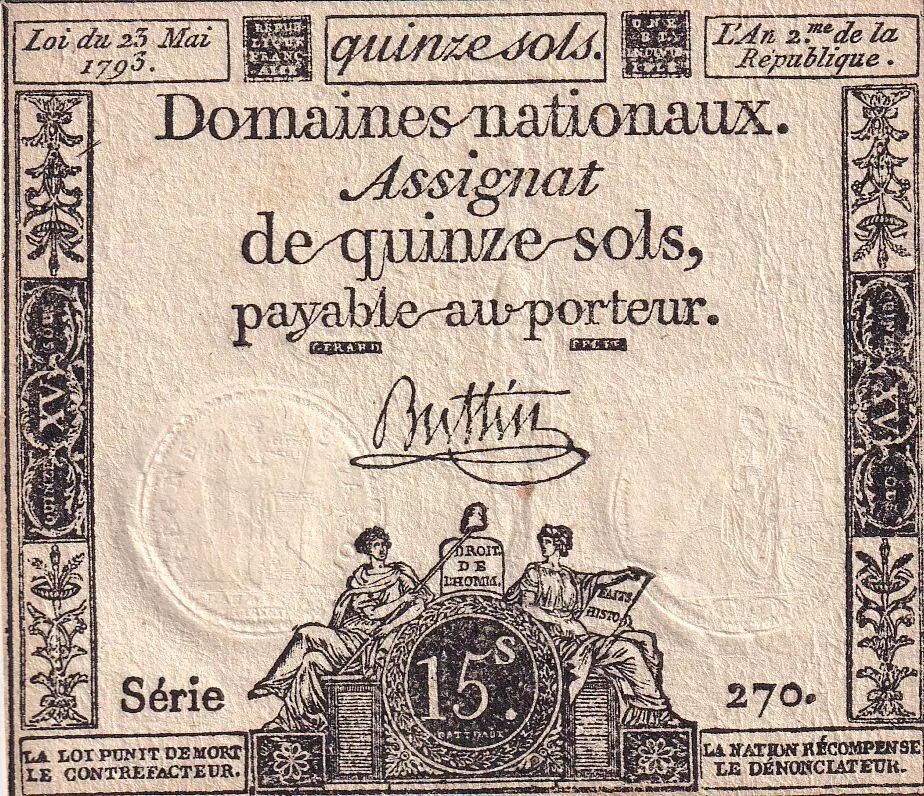 Banknote France 15 Sols - Women seated with Liberty cap on pole (1793-05-23) - XF - Sign. Buttin