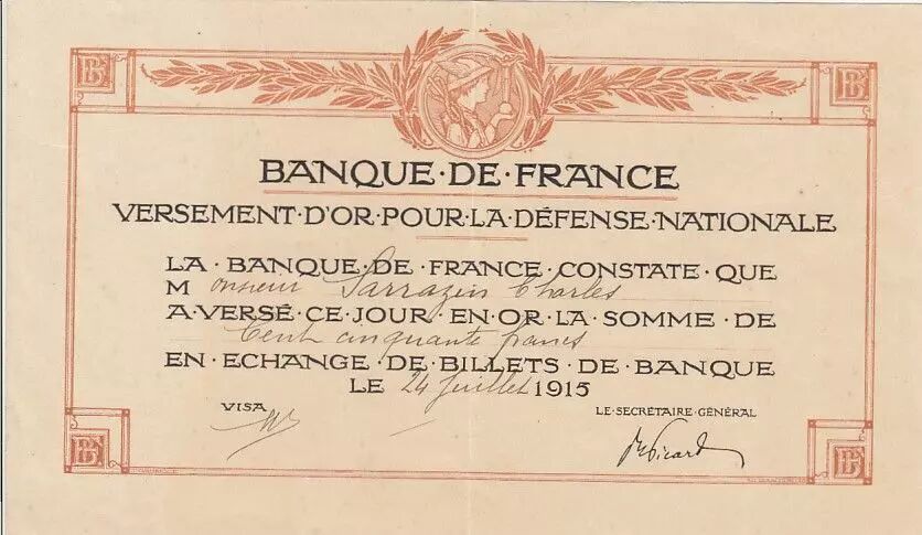 Billet France 150 francs - Versement d'or pour la défense nationale vierge - 24-07-1915